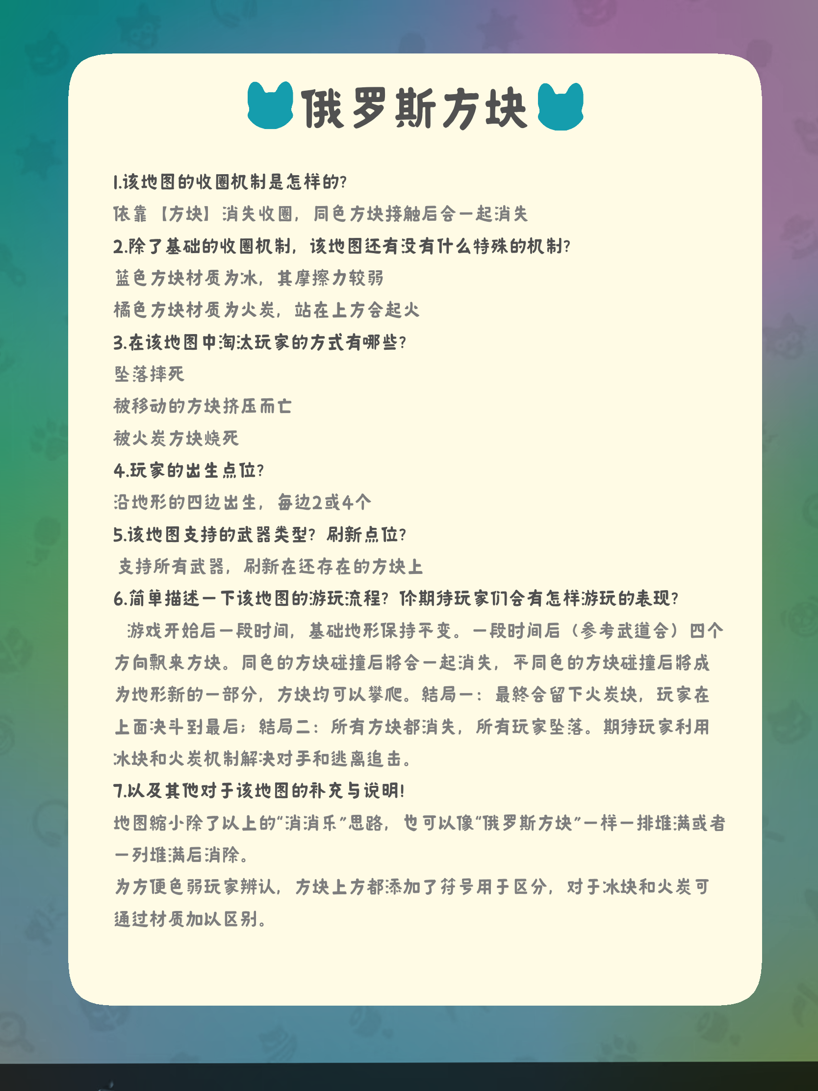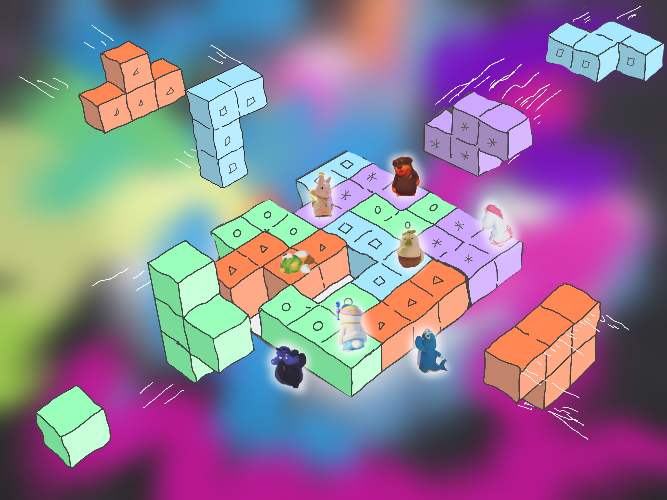 游戏开始后一段时间,基础地形保持不变。一段时间后(参考武道会)四个方向飘来方块。同色的方块碰撞后将会一起消失,不同色的方块碰撞后将成为地形新的一部分,方块均可以攀爬。