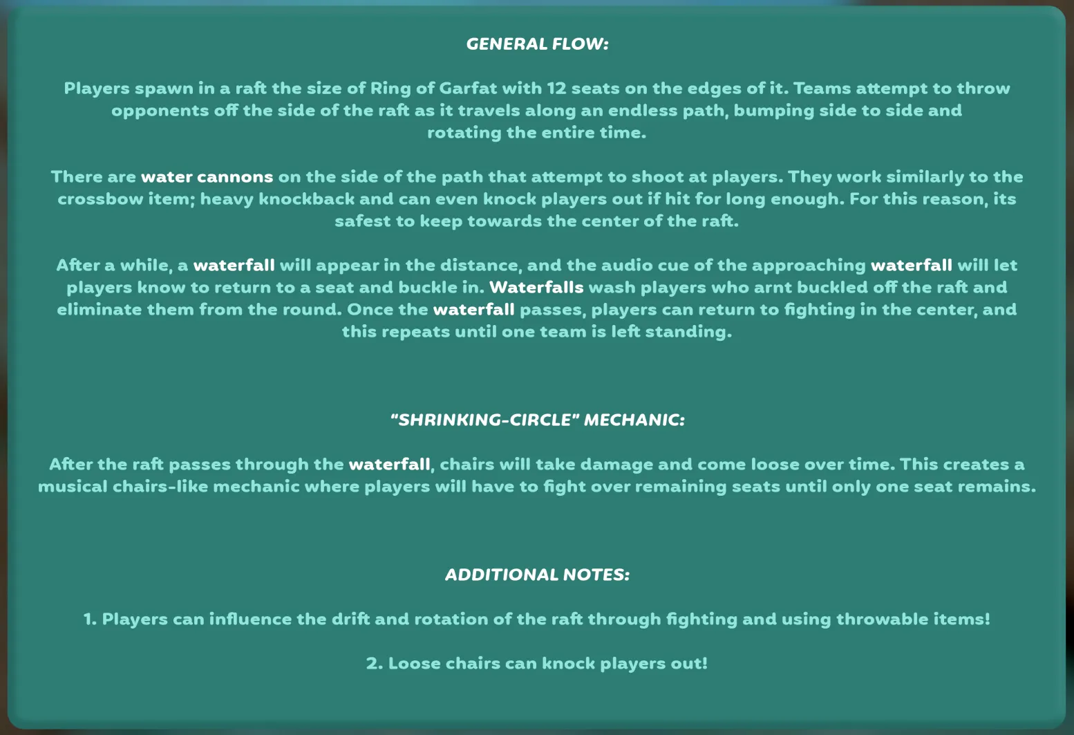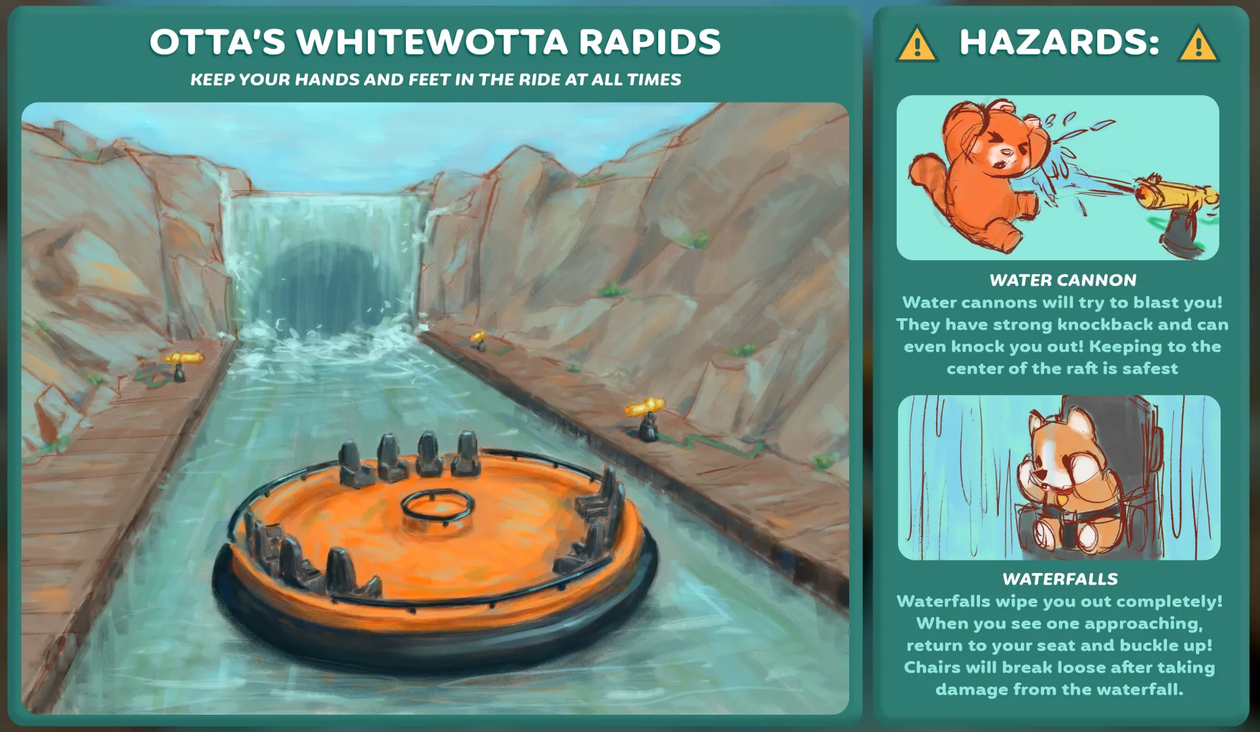 这个创意的灵感来源是主题公园中的激流勇进类水上游乐项目——玩家需要在被急流冲击、被水炮轰击的同时,努力把其他玩家从船上扔下去。另外,记得要小心瀑布!只有及时抢占船上的座椅,才能避免被水冲走。但这些座椅会在经过瀑布时受到损坏,并随着时间的推移逐渐松脱,直到只剩下一个座位——有点像「抢椅子」游戏!