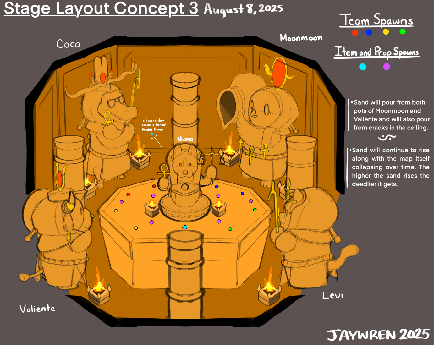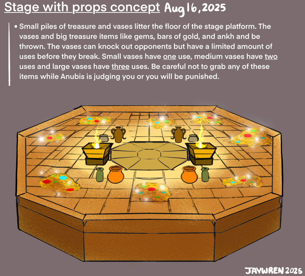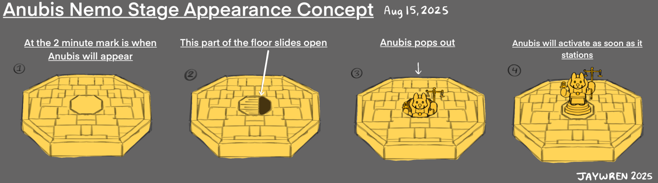 玩家会出生在场景中央平台的四周,环绕着阿努比斯即将出现的位置(希望我的概念图能比文字说得更清楚 😅)