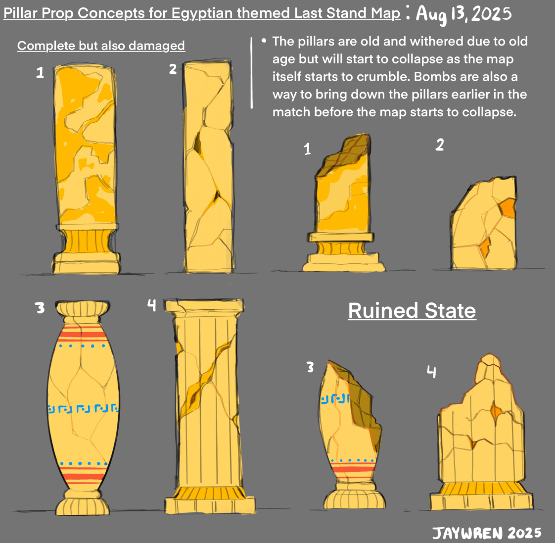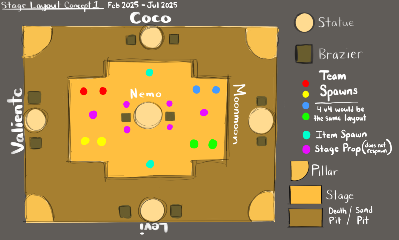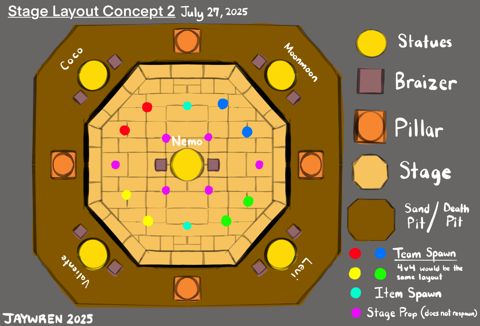 玩家会出生在场景中央平台的四周,环绕着阿努比斯即将出现的位置(希望我的概念图能比文字说得更清楚 😅)