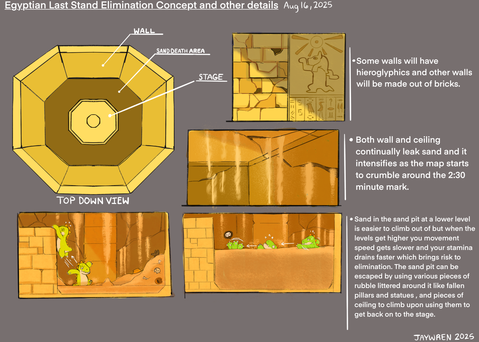 本地图的缩圈机制表现为围绕着关卡平台的坑洞中,不断上升的流沙。在回合开始时,流沙较浅,容易脱身;但随着时间推进,流沙会越变越深,在其中移动也会愈发困难,并且穿行其中会持续消耗体力。当体力耗尽时,你将被流沙完全吞没并被淘汰。流沙不仅会逐渐填满坑洞,而且最终会开始覆盖整个平台,因此玩家必须利用平台中央的「阿努比斯神像」攀爬到安全地带(神像需处于未激活状态)。也可以攀爬坍塌的柱子、残骸,以及青岛的巨型雕像来躲避危险。