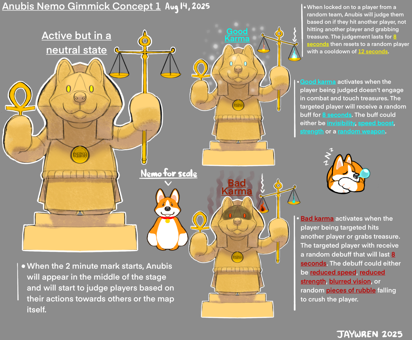 当比赛进行到 2 分钟时,舞台中央的「阿努比斯·尼莫」神像会从地面升起并启动,对玩家进行「善恶审判」。它一次只会锁定一名玩家,并且通过转动头部来追踪该玩家的一举一动审判期间,阿努比斯左手持有的天平会根据玩家的善恶水平向左或向右倾斜,并显示出红色或蓝色火焰。蓝色火焰代表「善举」,红色火焰则代表「恶行」。