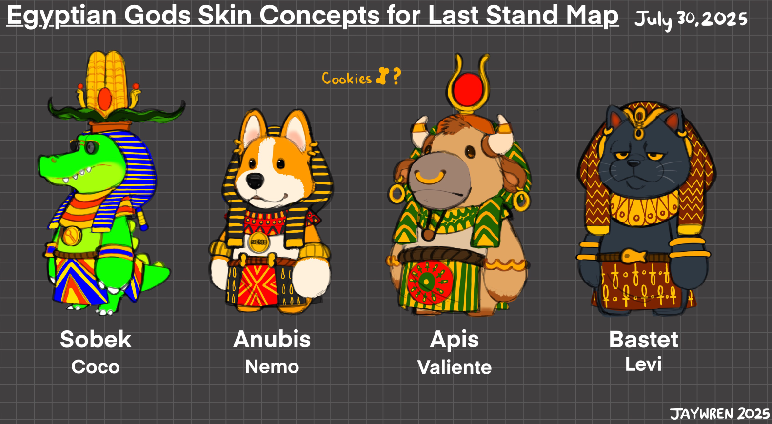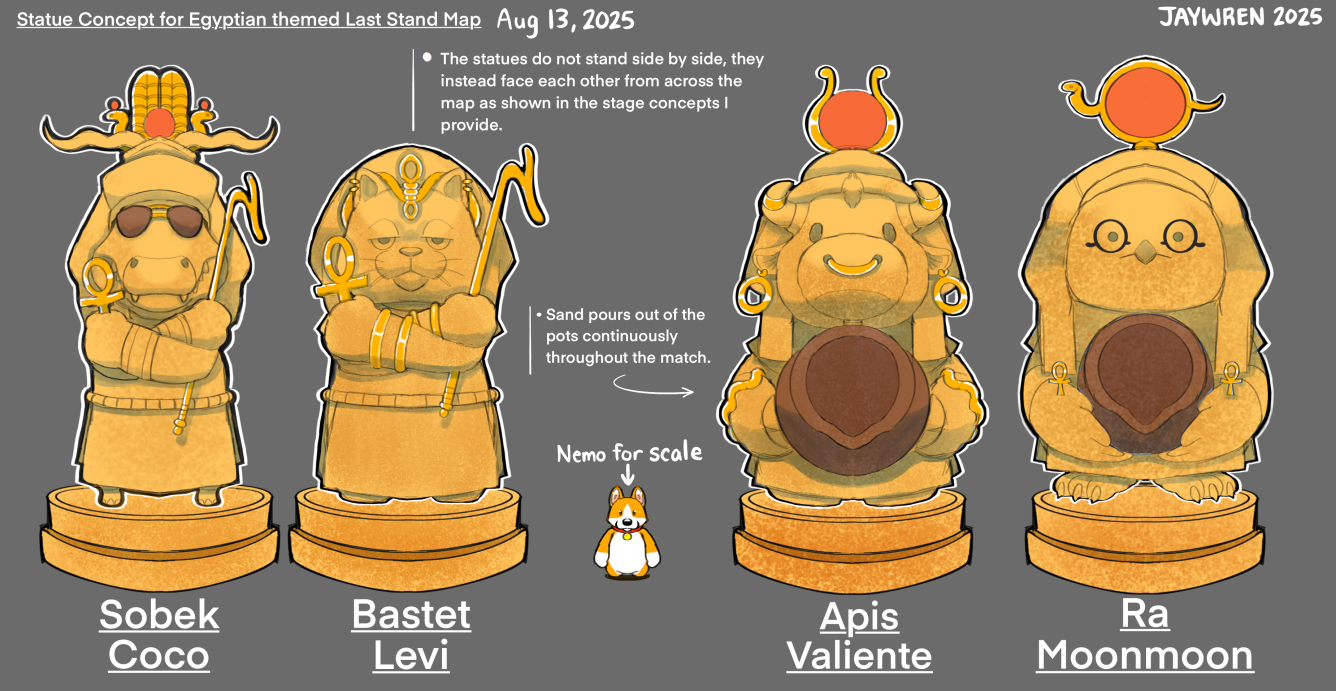 与场景中众神巨像所对应的,为鳄霸、尼莫、瓦力、利威尔、木木所设计的埃及众神系列皮肤将会非常契合本地图的风格。特别感谢 @ragnarocknstone 提出的「让木木化身为太阳神拉」的创意 🙂