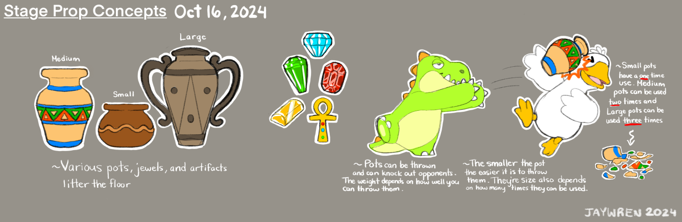 地图支持所有武器类型,并额外增加了花瓶这种场景交互道具。花瓶的使用次数有限。而场景中的宝物——比如钻石、绿宝石、红宝石、金条、小型安卡也可以被拿取和投掷。药水和菠菜不会在地图上自然生成,但是会在阿努比斯·尼莫的审判期间作为临时增益奖励。