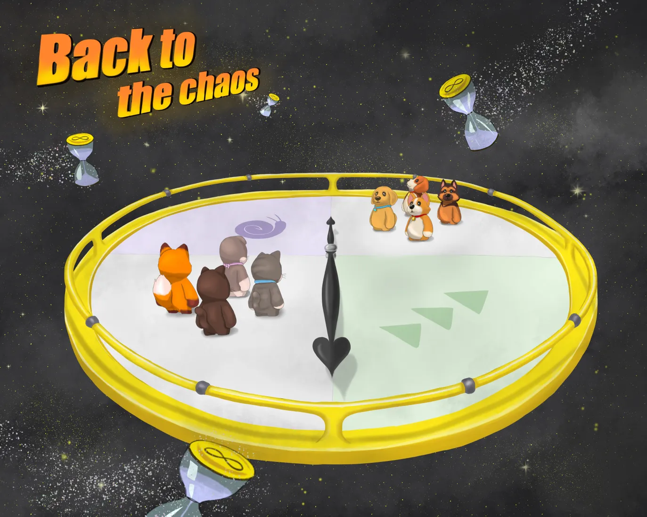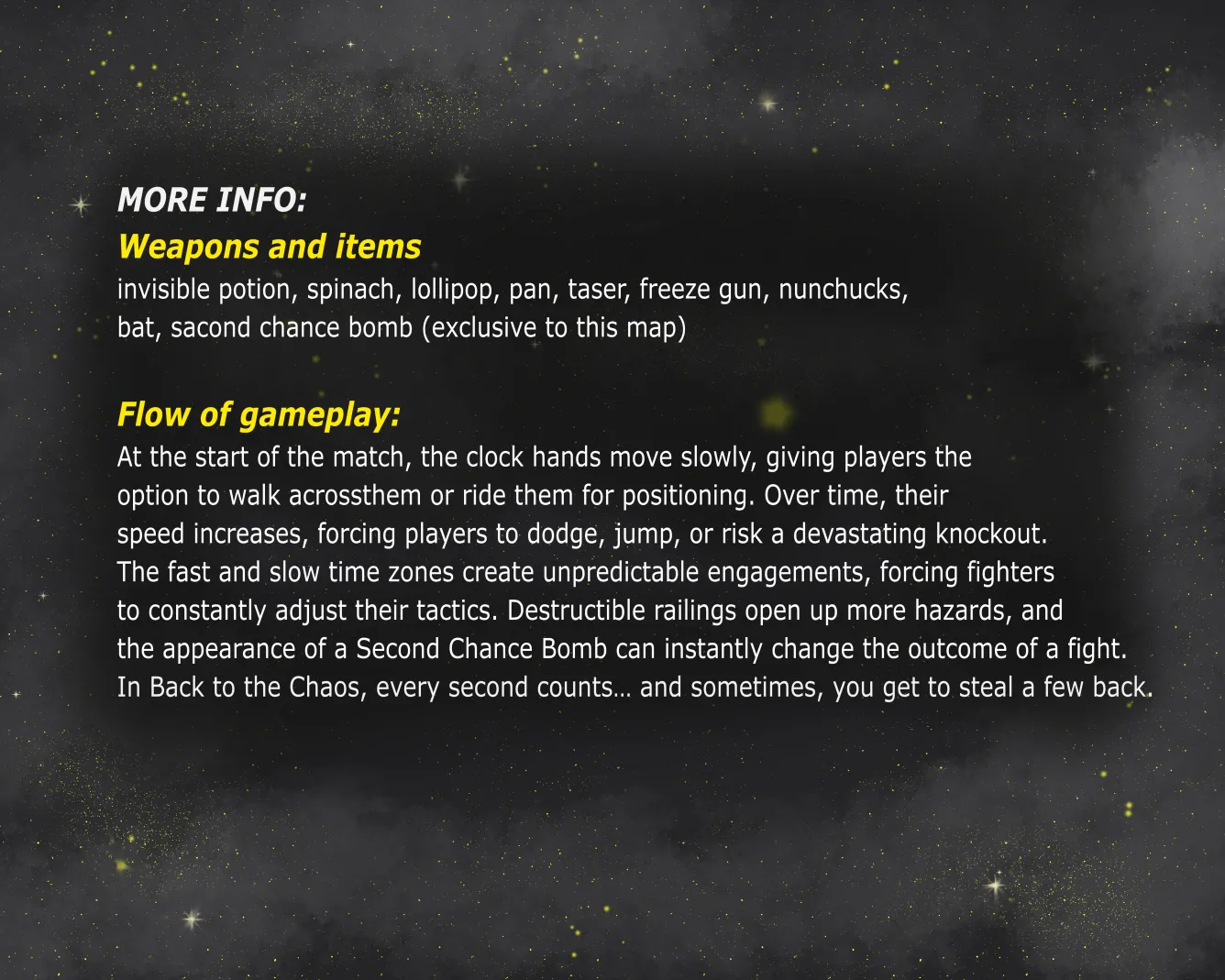 《重返混沌》地图是一个形如巨大钟表的战斗竞技场,漂浮在无尽虚空之中。场地中设有改变时间流速的多个区域、不断旋转的危险指针,以及可能逆转局势的「回档炸弹」。瞬息万变,适者生存。