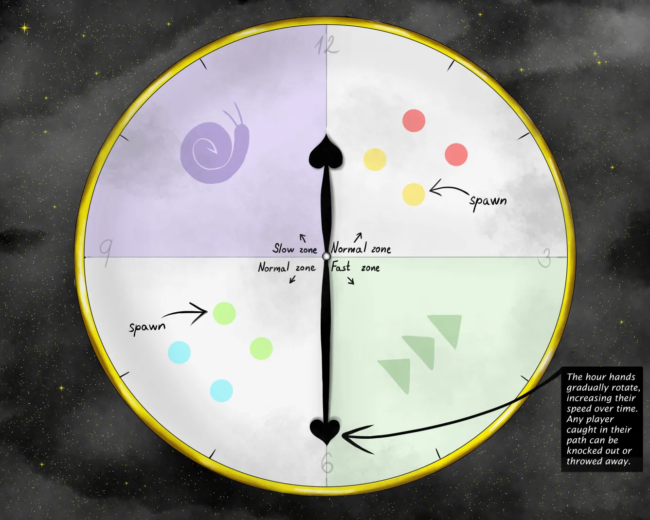 比赛开始时,钟表指针转动缓慢,玩家可以选择在上面行走或者乘着指针来调整位置。随着时间推移,指针逐渐加速,迫使玩家闪避、跳跃,否则就可能被强力击飞。