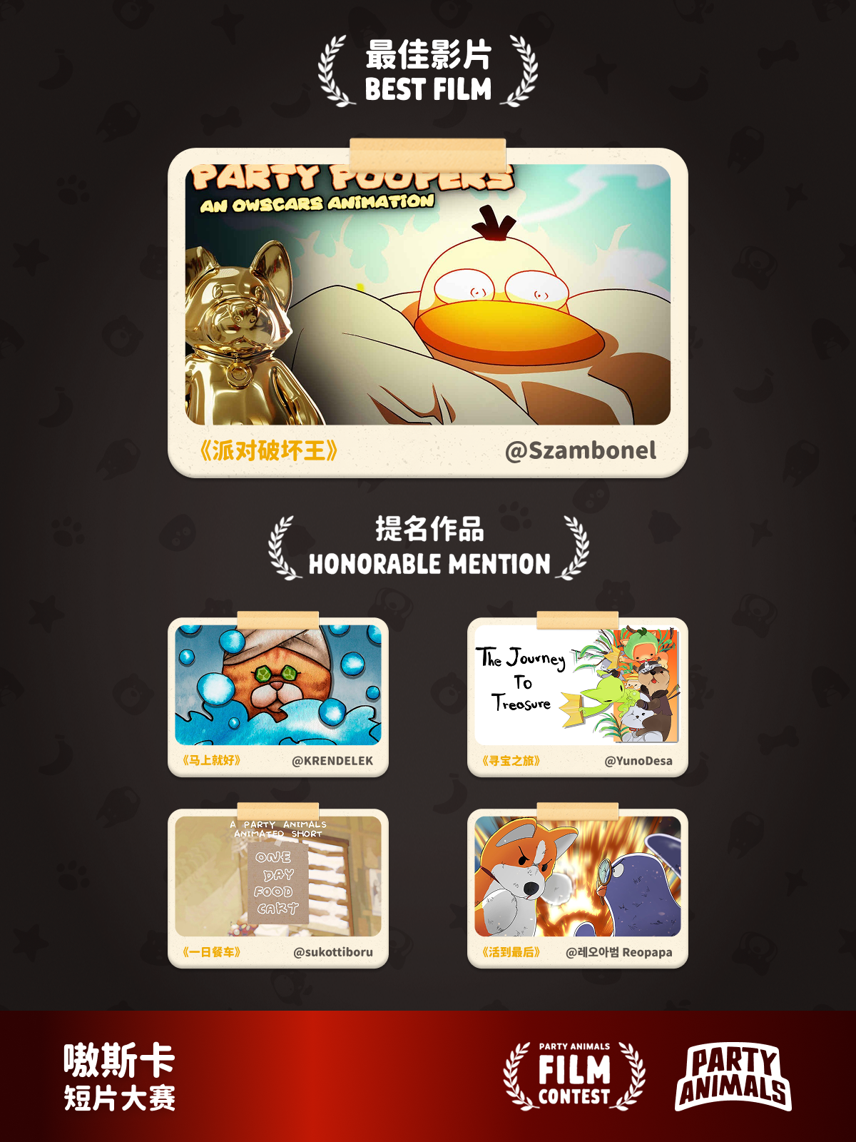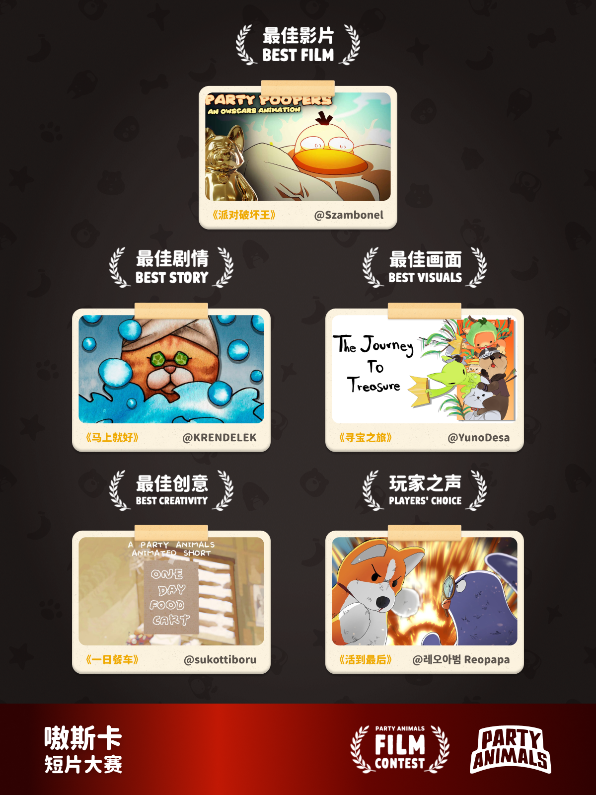 获奖者分别是:最佳影片 @Szambonel、最佳剧情 @KRENDELEK、最佳画面 @YunoDesa、最佳创意 @sukottiboru、玩家之声 @레오아범 Reopapa。