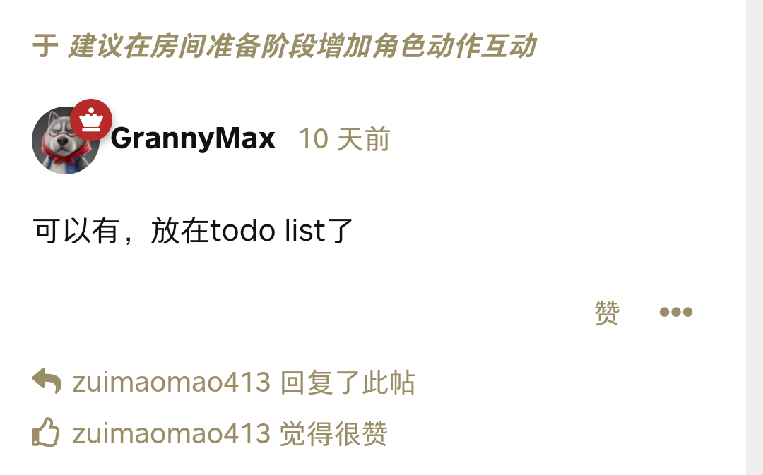 SmartisanVaeBF wolfling 作为常年混迹论坛的闲杂人等,对一些资讯有些了解,官方回复过其中一些类似的问题 以路人身份回答一下(仅代表我的想法和认知) 1.制作人说考虑在改这个武器任务了,方向是删除指定武器任务/减少次数; 2.匹配机制暂时应该不会大改,改动后会增加匹配时间; 3.4.还不错,我也觉得有意思,不知道制作人有没有意向; 5.我个人不喜欢,也少见有人提,应该不会这样; 6.如果给自定义房间分类,或许可以加到自定义房间里; 7.制作人看到过类似的建议(未获胜的队伍根据所得👑数有额外经验值),并给予了肯定,未来应该会有,我也想要点赞功能,不管是不是和经验挂钩; 8.我提过一个详细的饼干扭蛋机的方案的经验,制作人没有详细回应,说在改动扭蛋机重复皮肤回收机制,但需要时间,说饼干用途会随着模式和地图增加来慢慢公布; 9.10. 11.借你吉言; 12.支持; 13.印象中制作人提过会制作一个类似于训练场的东西; 14.支持,我想的是,如果在计分板能看队友是否存活就好了; 15.如果举报成功了,游戏内会有官方回复,另外如果有人很恶劣,多个人举报会加快处理速度。 另外补充,制作组目前精力在玩法更新和地图模式制作上,我们提的一些建议啥的,可能一时半会实现不了,但是相信他们会参考的,遇见好的就会加入To do list